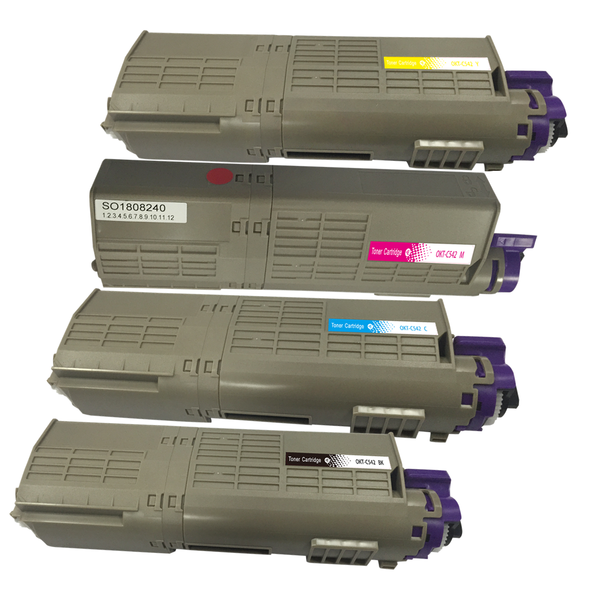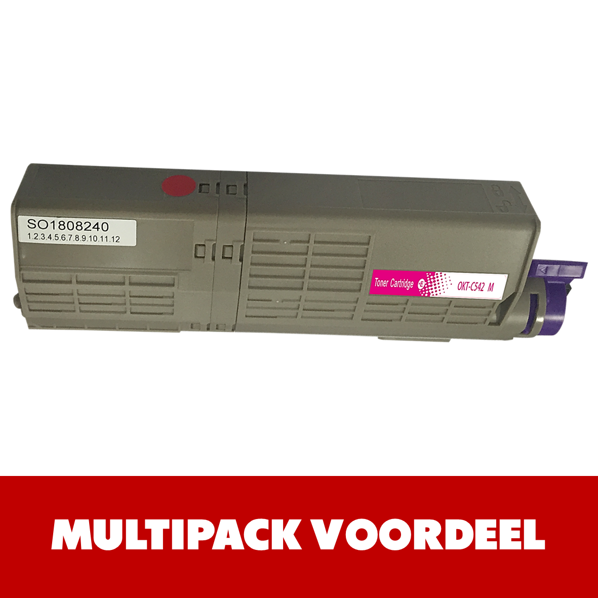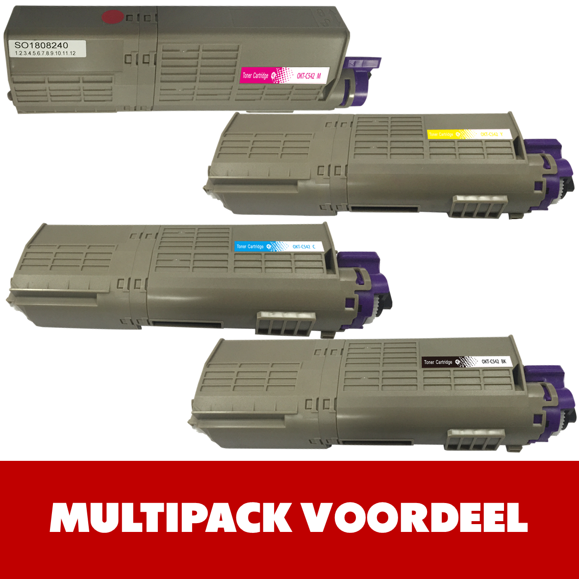 De OKI C542 Kleuren Toner Set bestaande uit toners: 46490608 BK/ 46490607 C/ 46490606 M/ 46490605 Y en printen maar liefst 7000 zwarte en 6000 kleuren pagina's i.p.v. 1500 zwarte en 1500 kleuren pagina's (5% Bedekkingsgraad).